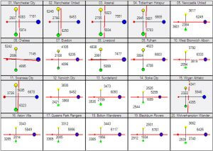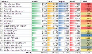 This is my second analysis of the 2011/12 EPL Opta dataset provided by the MCFC project. In my previous one, I looked at Pass direction in order to refute the Fink Tank analysis on Long balls. In the process, I produced some graphs which actually give further support to my conclusion, and are a clear demonstration of the power of visual analysis.