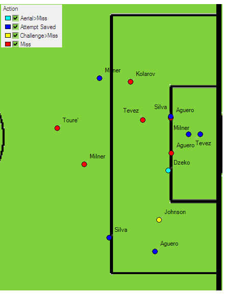 The visualisations clearly show City’s preference for attacking from the left half of the pitch. With only three of Manchester City’s 14 shots coming from the right, Bolton’s defenders in that part of the pitch must have enjoyed a quiet afternoon.
