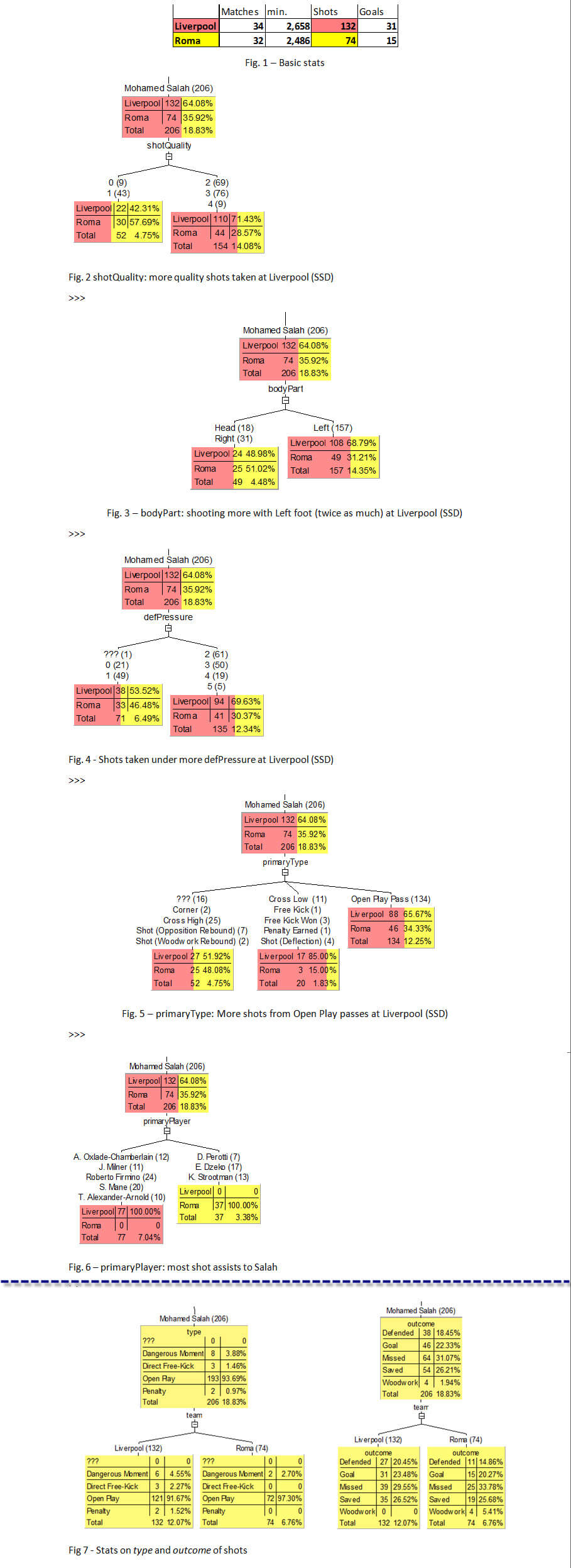 In this post we compare the shot performance of M Salah at Roma and Livepool. The objective is to find statistically significant (p<0.05) and non significant (but revealing) differences in his performance while at these clubs Significant differences, when discovered, are indicated by the acronym SSD (Statistical Significant Difference) in their comment line.